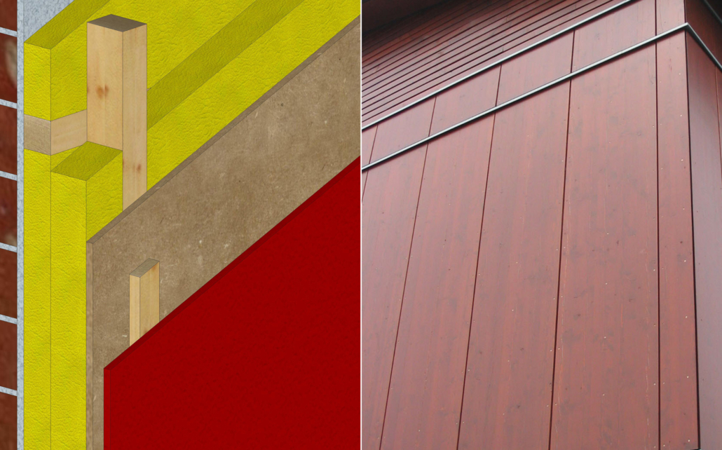 Für die Fassade gibt es eine Vielzahl an großformatigen Plattenwerkstoffen. Bewährt haben sich HPL-Platten auf Basis hochverdichteter phenolharzgetränkter Papiere. Da dickere Platten formstabiler gegen thermische Verformungen sind, werden bei der Fassadenbekleidung Dicken von 8 oder 10 mm empfohlen. Eine mineralische Alternative bietet die Trägerplatte aus Faserzement. Zement und Zuschlagsstoffe werden mit textilähnlichen Fasern armiert. Die Oberflächen beider Werkstoffe sind dauerhaft und bleiben „farbecht“ (UV-beständig) durch spezielle Beschichtungsverfahren auf Basis von Acrylaten und kratzfesten Schlussbeschichtungen. Standardfarben sind ab Lager verfügbar. Auf Bestellung ist aber nahezu alles möglich, bei HPL bis zum Fotodruck. Handelsübliches Format ist die Breite 1,25 m und eine typische Geschosshöhe von bis zu 3,0 Metern.
